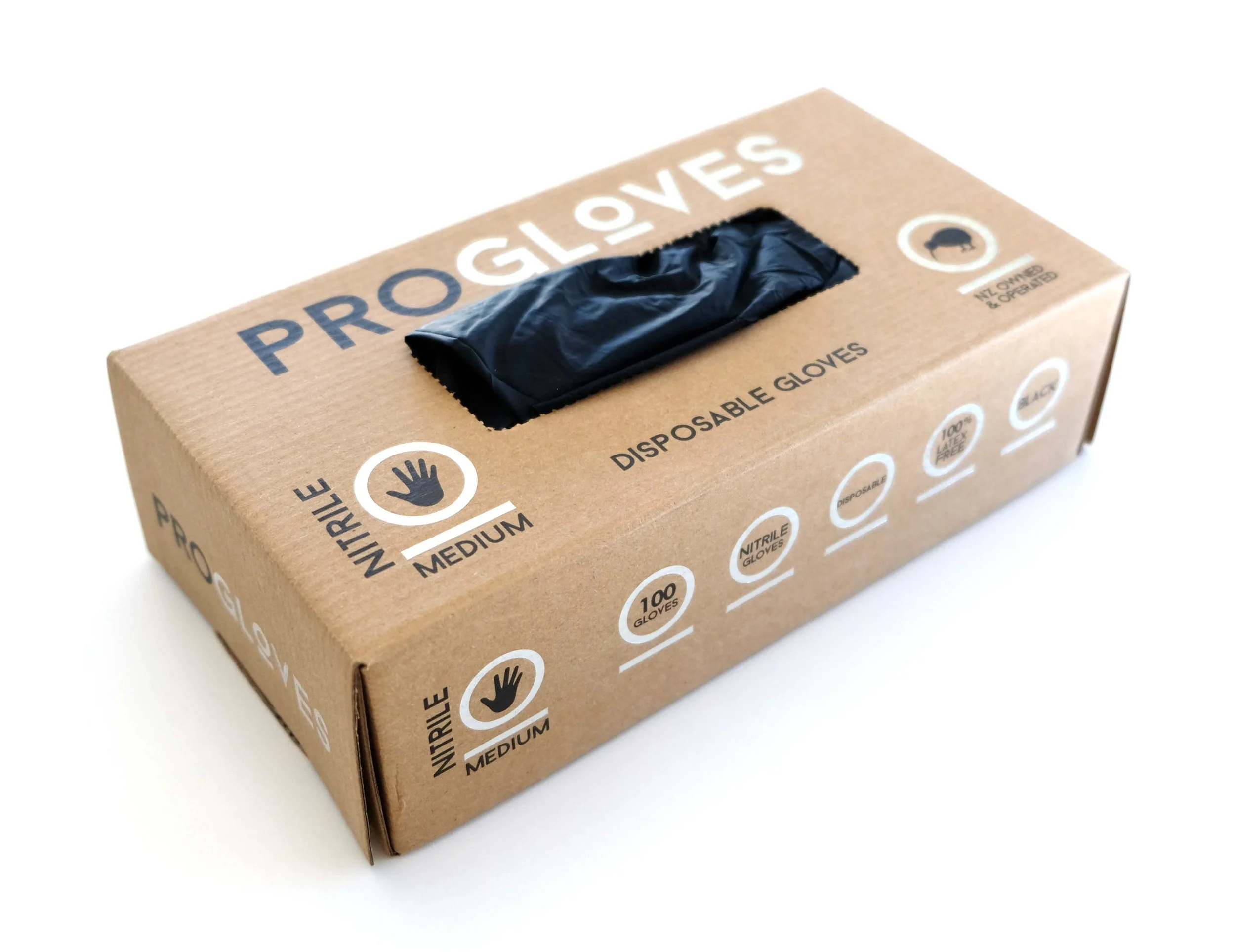 Each box contains 100 disposable, black rolled cuff gloves encased in 100% recyclable packaging.